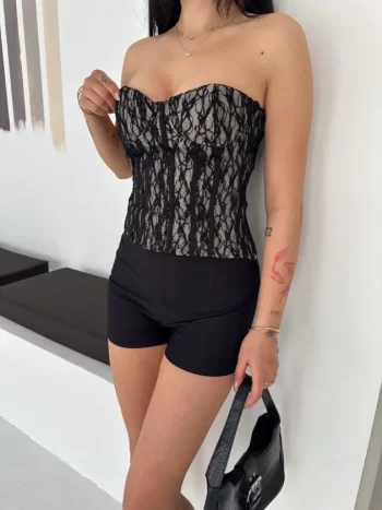 - Fermuarlı Dantel Korse Straplez Bustiyer Transparan Şık Top – Siyah