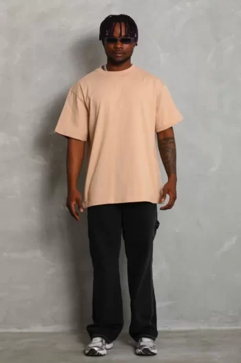 - Düz Dokulu Unisex Salaş Stil Bej Oversize Bisiklet Yaka Tişört