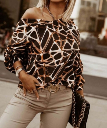 - şardonlu Kadın Sıcak Tutan Uzun Kollu V Yaka Düşük Omuz Geometrik Desen Dalgıç Bluz