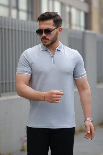 Erkek Gri Pike Kumaş Düğmeli Yaka Regular Fit Günlük Kısa Kol Tişört