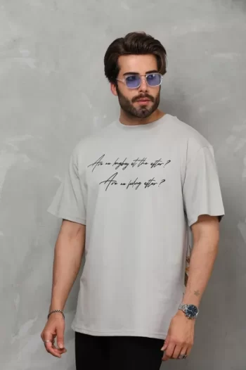 Baskılı Unisex Günlük Stil Gri Bisiklet Yaka Oversize Tişört