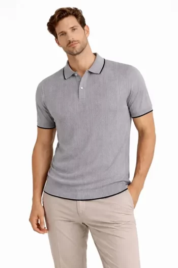 Desenli Erkek Gri Düğmeli Yaka Triko Dokuma Tişört Yazlık Şık Günlük Triko Tişört
