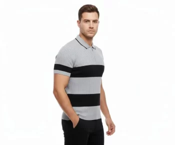 - Erkek Günlük Stil Gri Çizgili Triko Dokuma Kumaş Polo Yaka Yarım Fermuarlı Regular Kalıp Tişört
