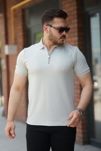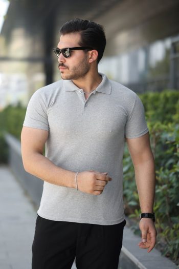 Erkek Yazlık Triko Saç Örgü Tişört Kısa Kol Polo Yaka Fermuarlı T-Shirt – Gri