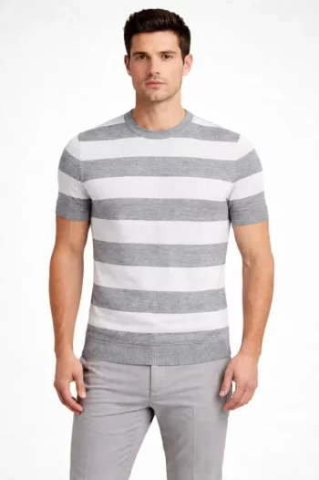 Erkek Günlük Stil Gri Çizgili Triko Dokuma Bisiklet Yaka Tişört