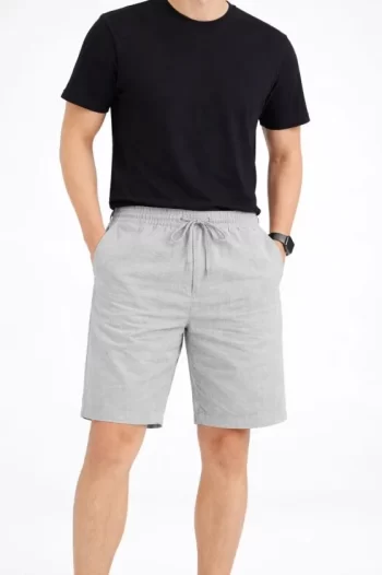 Erkek Rahat Kullanım Gri Keten Kumaş Cepli Rahat Kesim Bel Lastikli Şort