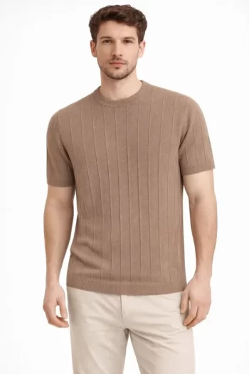 Erkek Günlük Stil Kahverengi Yazlık Fitilli Kısa Kol Bisiklet Yaka Tişört Triko Tişört