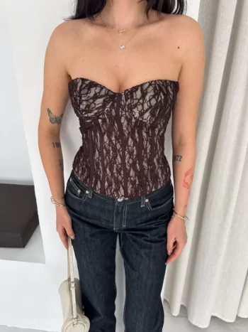 Fermuarlı Dantel Korse Straplez Bustiyer Transparan Şık Top – Kahverengi