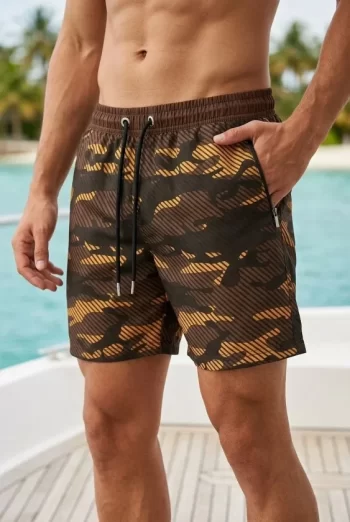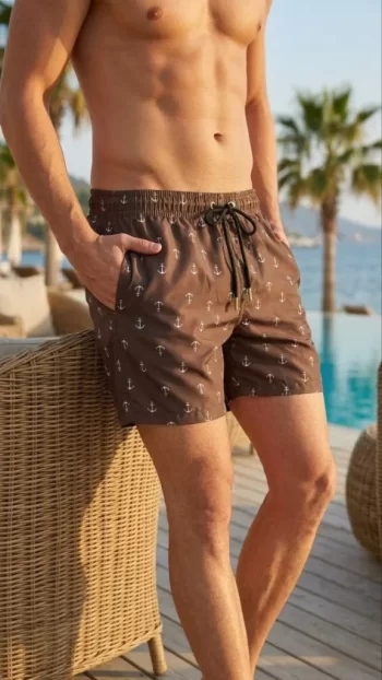 Erkek Deniz Şortu Fermuarlı Cepli File Astarlı Hızlı Kuruyan Premium – Kahverengi