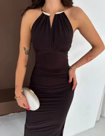 Kadın Rahat Duruş Kahverengi Yırtmaçlı Diz Altı Vücudu Saran Gecelik