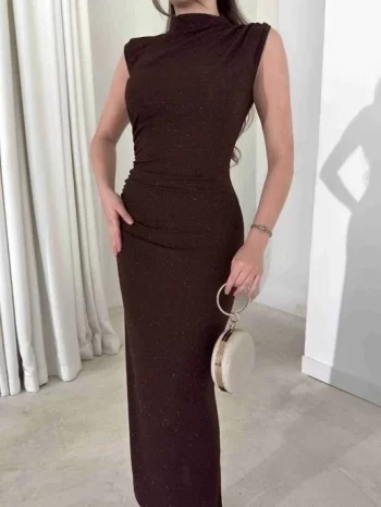 Likralı Simli Kumaş Yandan Yırtmaçlı Uzun Elbise Şık Kolsuz Abiye – Kahverengi
