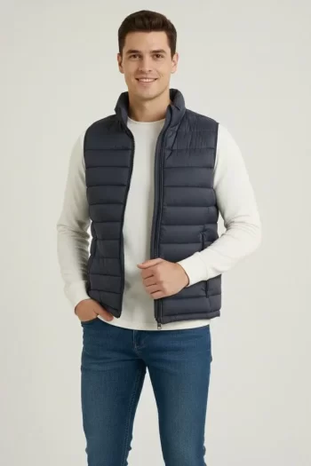 Erkek Günlük Şıklık Lacivert Şişme Fermuarlı Su Itici Kapitone Astarlı Kumaş Cepli Hafif Kışlık Spor Rahat Kalıp Yelek