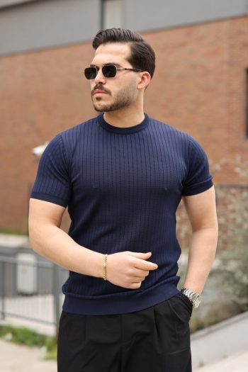 Erkek Günlük Stil Lacivert Fitilli Triko Dokuma Kısa Kol Yarım Boğaz Modern Yazlık Tişört