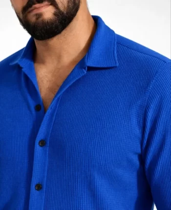 - Waffle Kumaş Erkek Günlük Şıklık Saks Mavisi Uzun Kollu Düğmeli Açık Yaka Regular Fit Gömlek