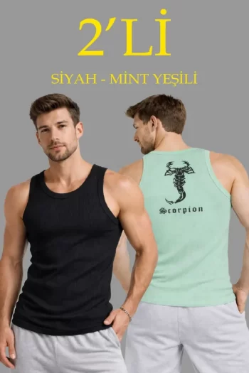 - Arka Baskılı Erkek Fit Duruş Spor Fitilli Atlet 2’li Set Siyah Ve Mint Yeşili Slim Fit Kaşkorse Spor Atlet