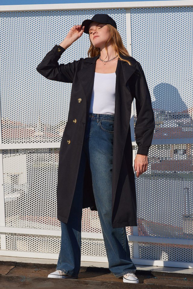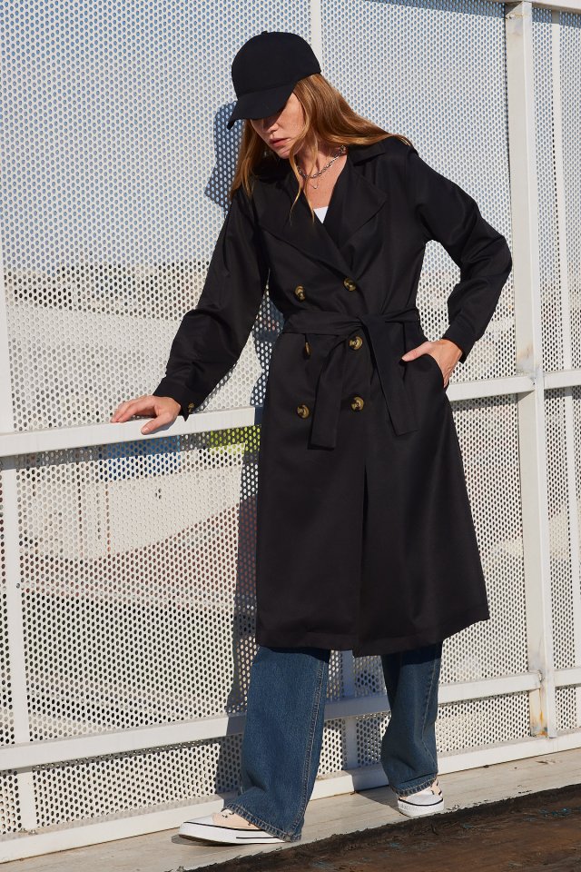 Kadın Modern Stil Siyah 5853 Kruvaze Yaka Trençkot