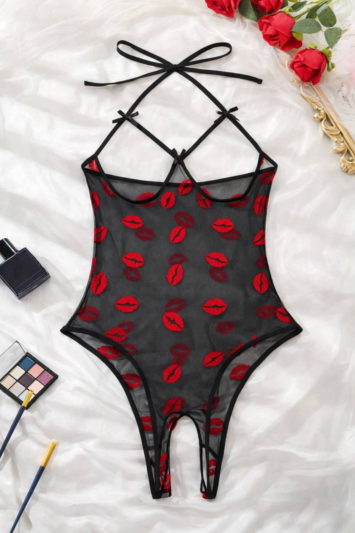 Baskılı Kadın Modern Stil Siyah Öpücük Transparan Fantazi (Özel Tasarım) Body