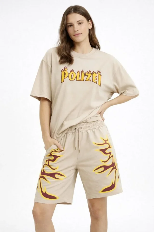 Bej Oversize Baskılı Tişört Şort Takım Cepli Şort Yazlık Rahat Günlük Kombin – Bej