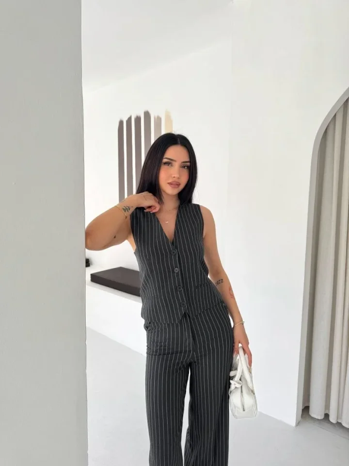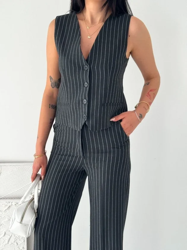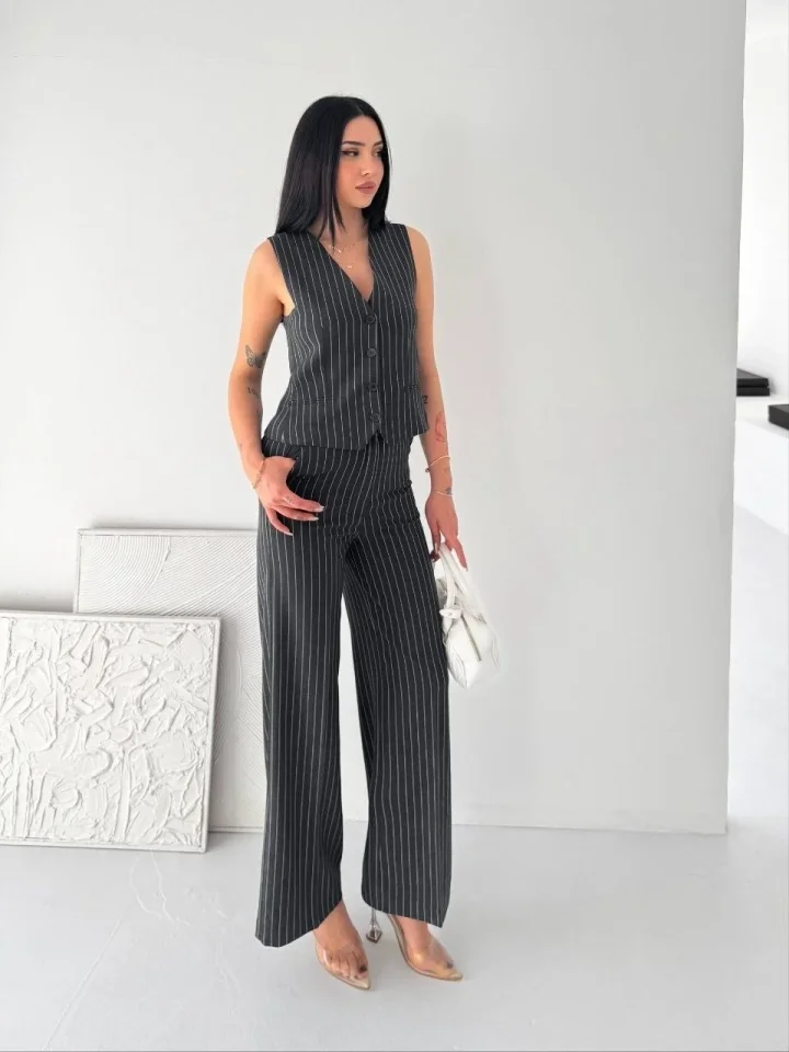 Çizgili Tansel Kumaş Yelek Pantolon İkili Takım Ofis Şık Modern – Füme