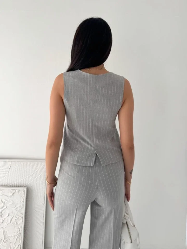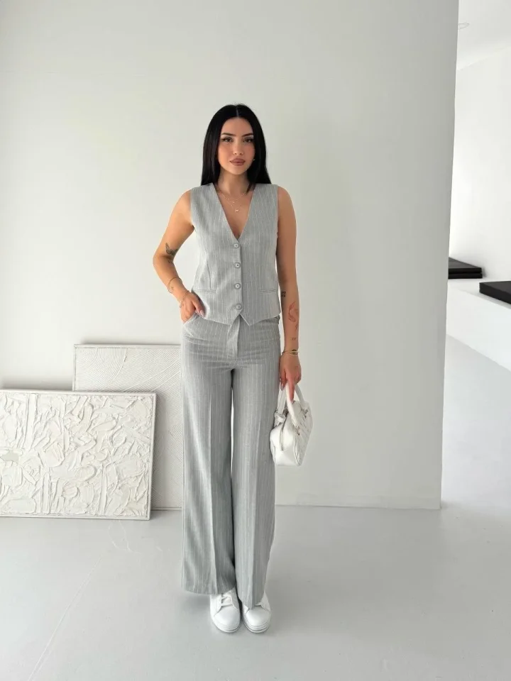 Çizgili Tansel Kumaş Yelek Pantolon İkili Takım Ofis Şık Modern – Gri