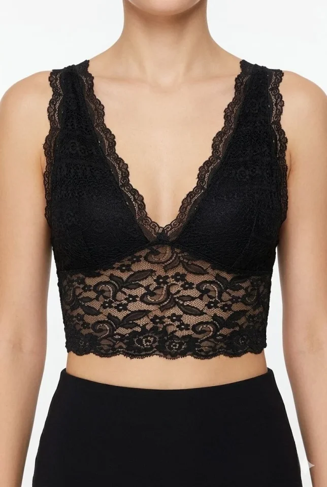 Dantel Bralet Crop Sütyen V Yaka Askılı Şık Esnek Rahat – Siyah