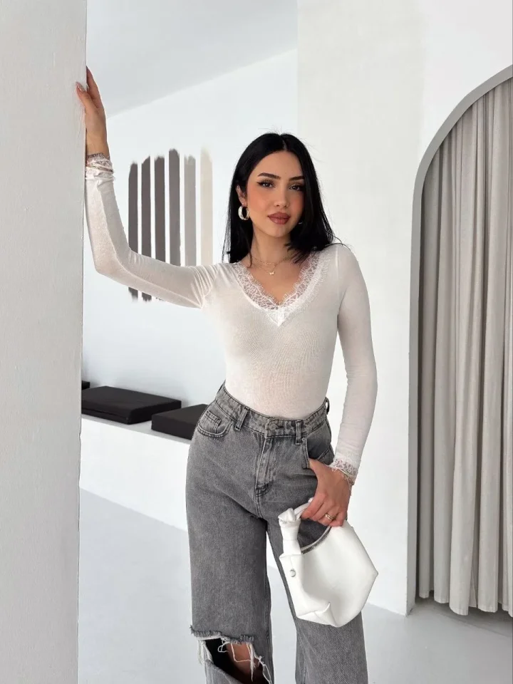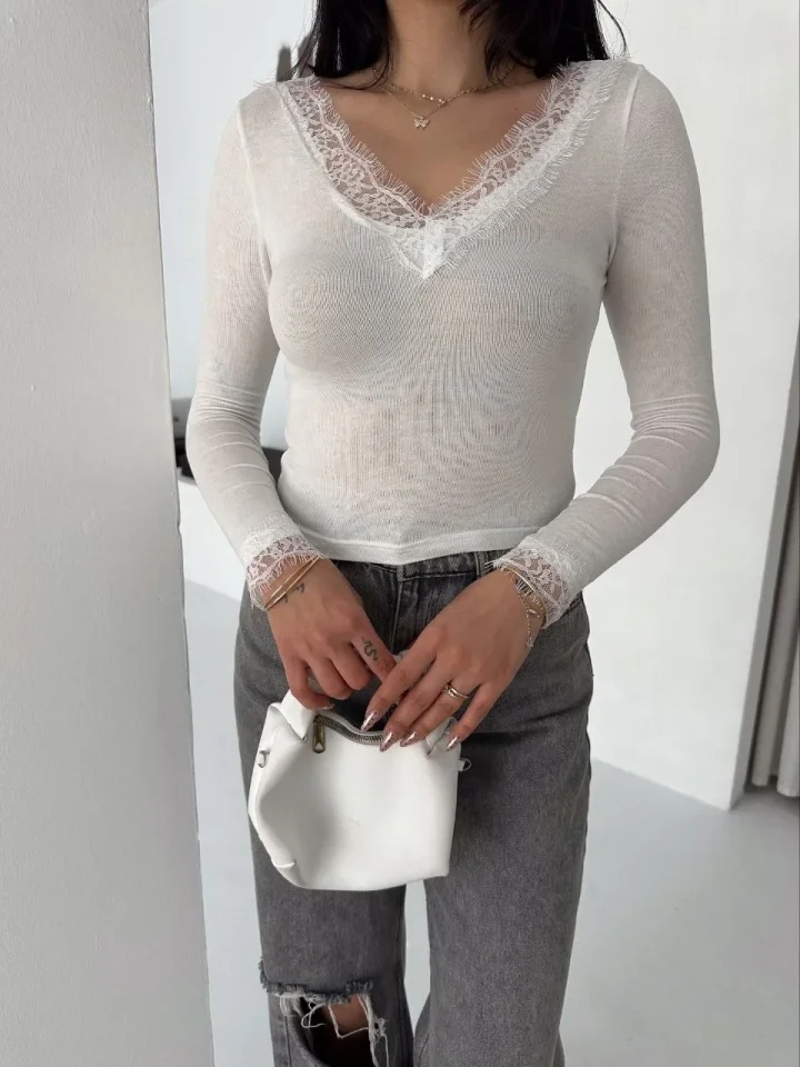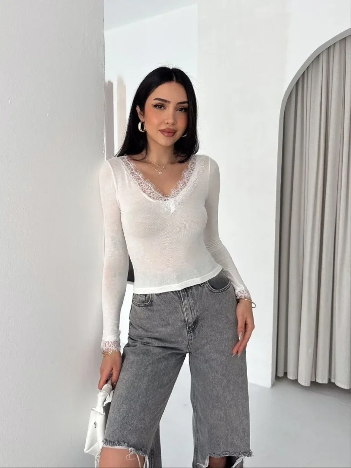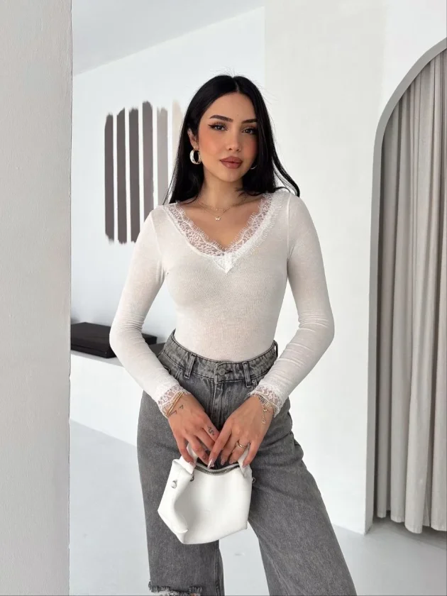 Dantel Detaylı V Yaka Arkası V Yaka Kaşmir Dokulu Uzun Kollu Bluz – Beyaz