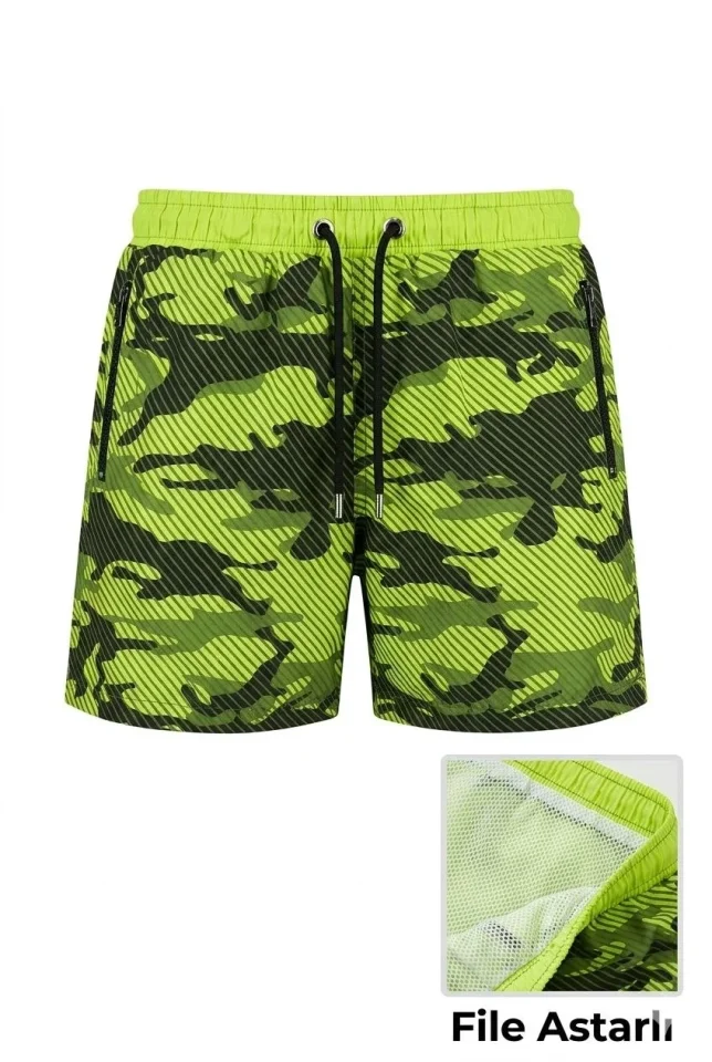 Deniz Şortu Fermuarlı Cepli File Astarlı Hızlı Kuruyan Premium - Neon Yeşili
