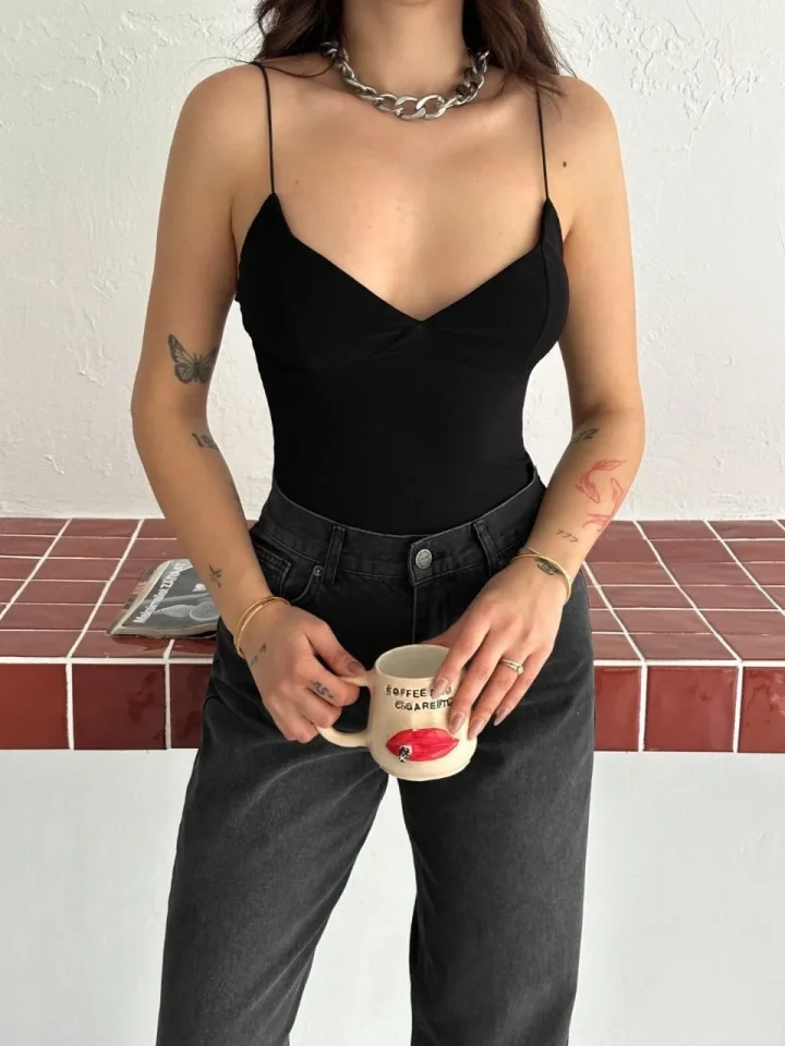 Derin Dekolte Askılı Body Sırt Dekolteli Şık Kolsuz Yazlık Bodysuit – Siyah