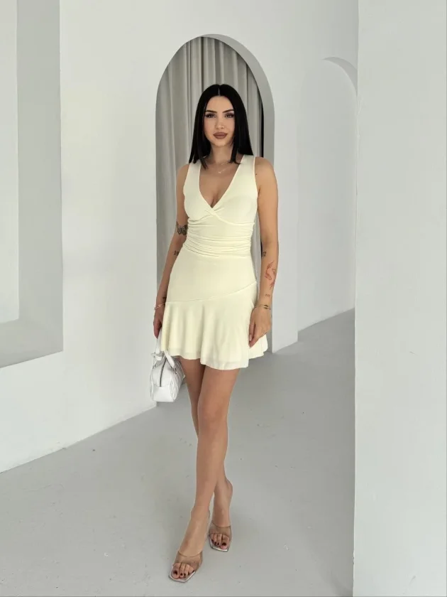 Derin V Yaka Sırt Dekolteli Mini Elbise Drapeli Şık Kolsuz – Açık Sarı