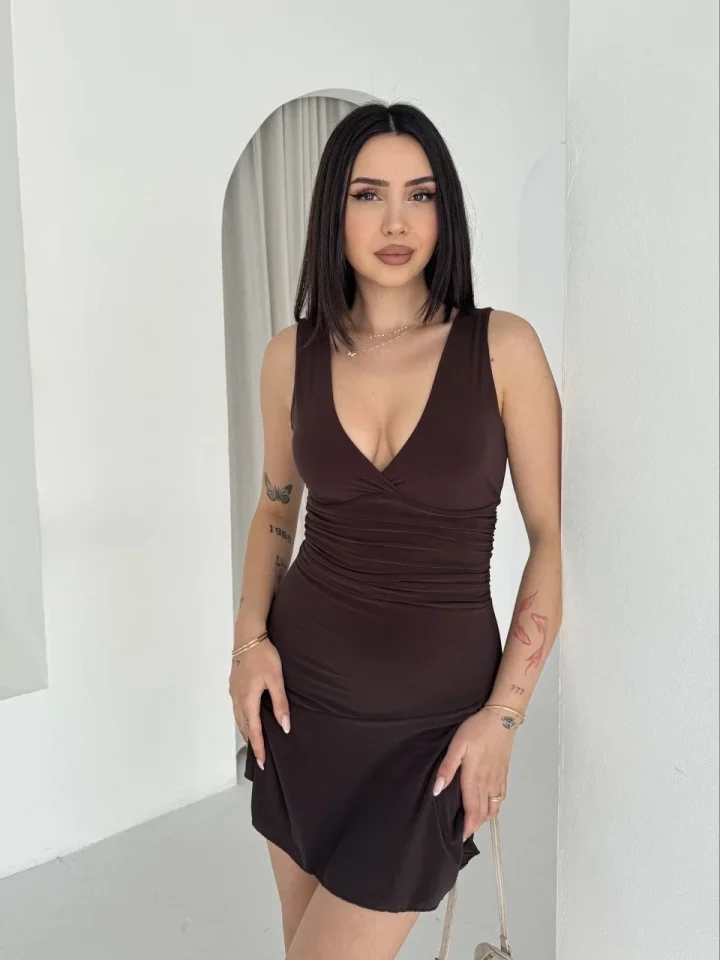 Derin V Yaka Sırt Dekolteli Mini Elbise Drapeli Şık Kolsuz – Kahverengi