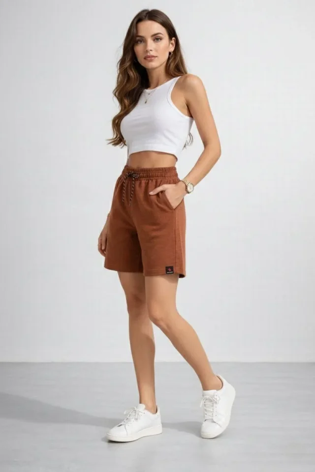 Dokuma Otoban Şort Beli Lastikli Bağcıklı, Cepli, Rahat Kesim Günlük Yazlık Şort – Kahverengi
