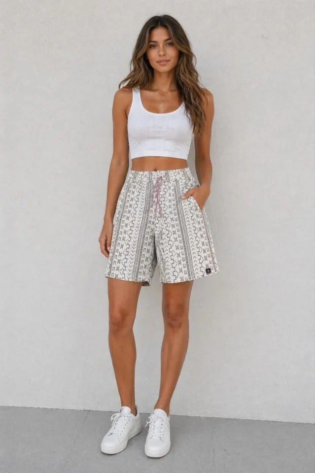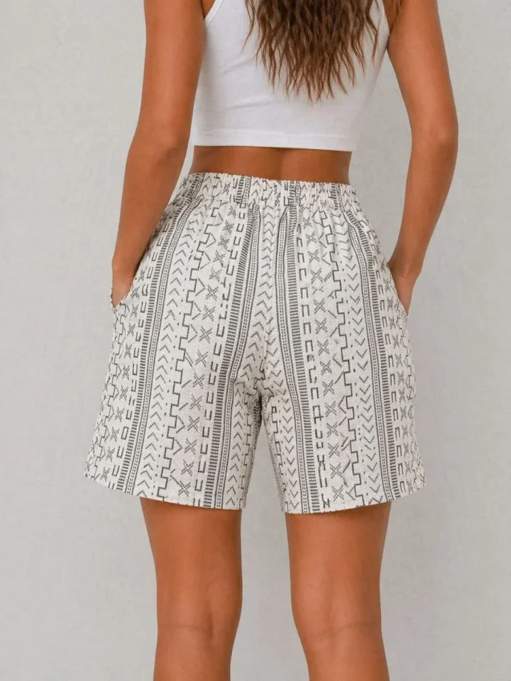 Dokuma Şort Etnik Desenli Lastikli Bağcıklı Bel Cepli Yazlık Rahat – Bej