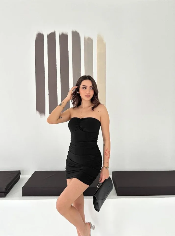 Drapeli Straplez Mini Elbise Esnek Kumaş Vücuda Oturan Gece Elbisesi – Siyah