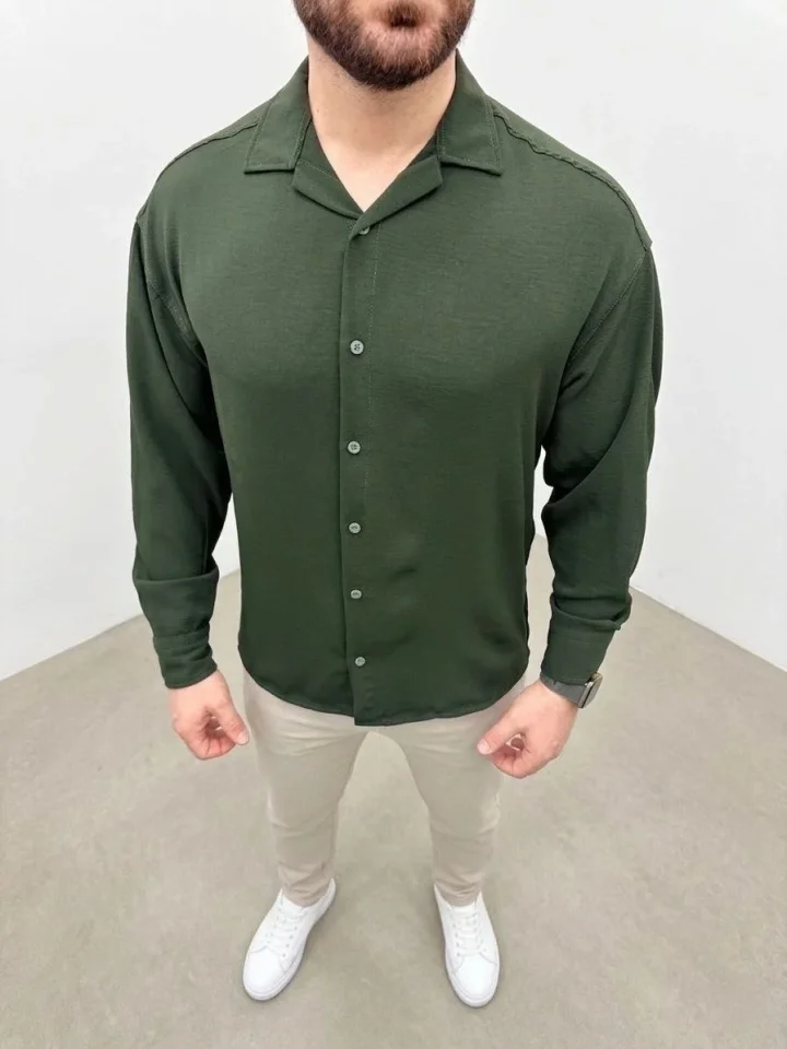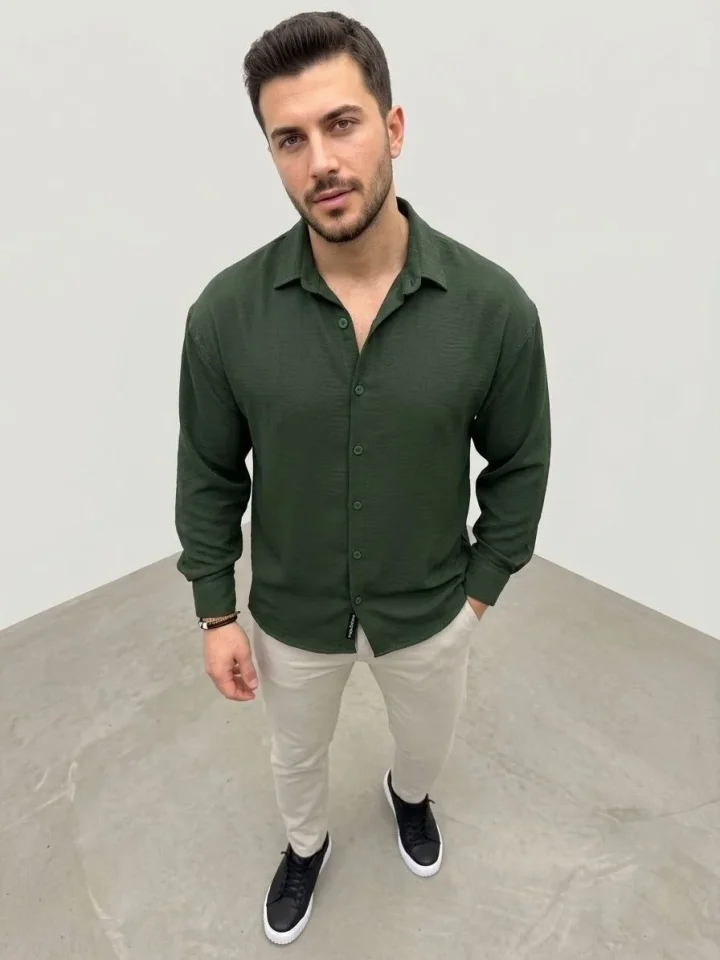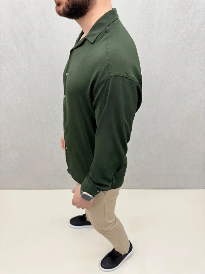 Erkek Aerobin Kumaş Oversize 4 Mevsim Uzun Kollu Rahat Kalıp Gömlek – Haki