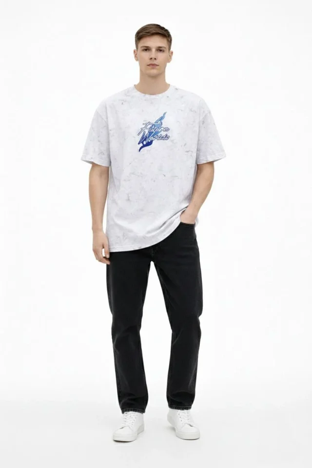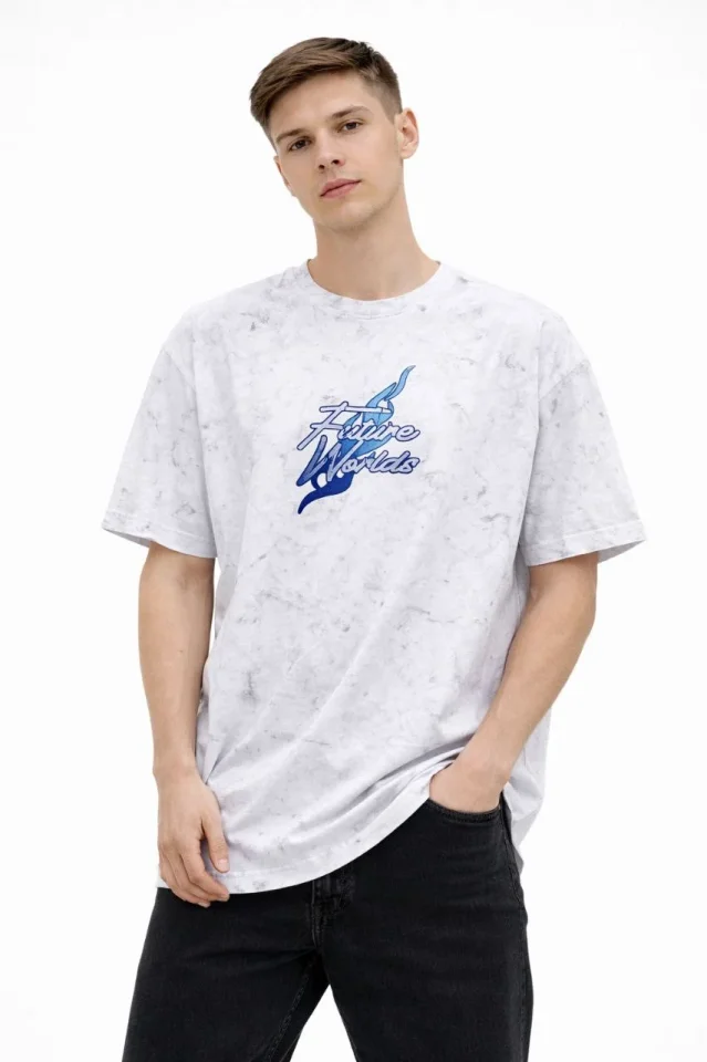 Erkek Asit Yıkamalı Oversize Tişört Future Worlds Baskılı Bisiklet Yaka Kısa Kollu Streetwear %100 Pamuk Street Style T-Shirt – Beyaz