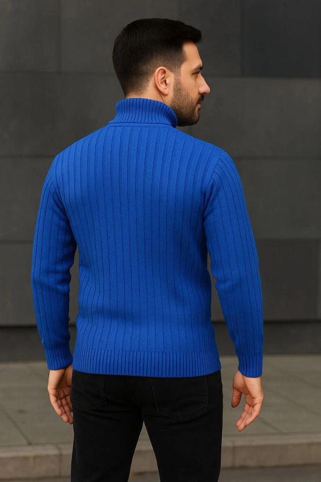 Erkek Balıkcı Yaka Bağazlı Triko Kazak Pamuklu Kalın Fitilli Dokuma, Regular Fit Uzun Kollu Kışlık Model – Saks Mavisi