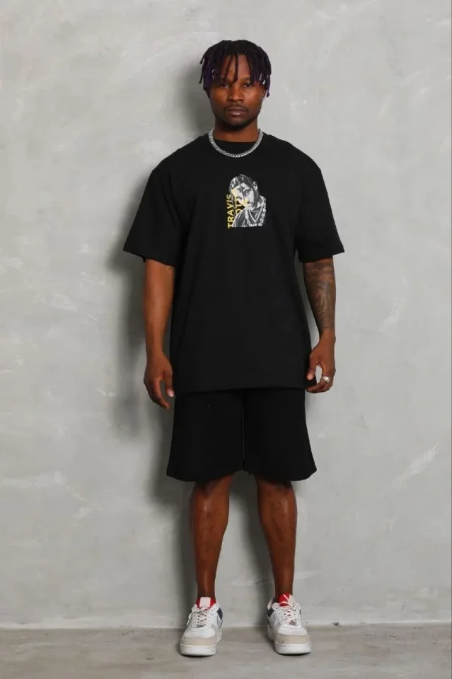 Baskılı Erkek Siyah Kısa Kol Bisiklet Yaka Regular Fit Rahat Kalıp Günlük Tişört