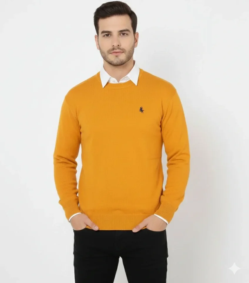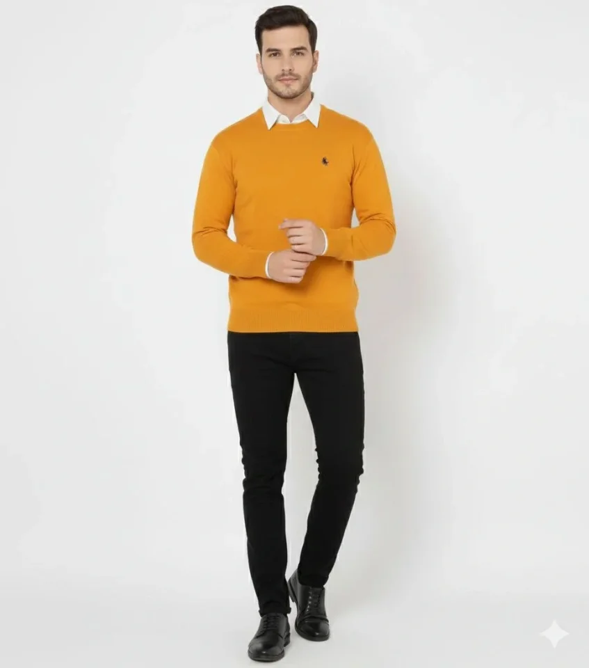Erkek Bisiklet Yaka Nakış Işlemeli Triko Kazak Yumuşak Dokulu Pamuklu Ince Dokuma, Uzun Kollu Rahat Regular Kalıp – Turuncu