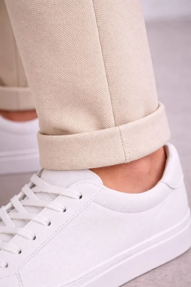 Erkek Diagonel Mikro Dokulu Duble Paça Cepli Pantolon Bağcıklı Bel, Modern Kesim – Krem
