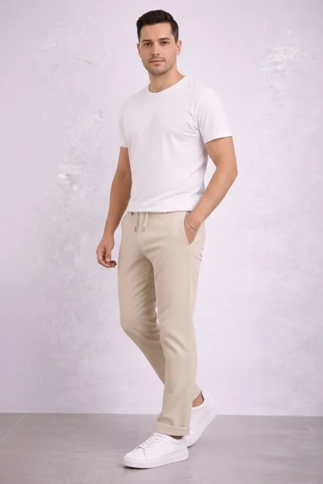 Erkek Rahat Kullanım Krem Diagonel Mikro Dokulu Duble Paça Cepli Bağcıklı Bel, Modern Kesim Pantolon