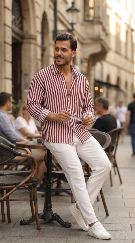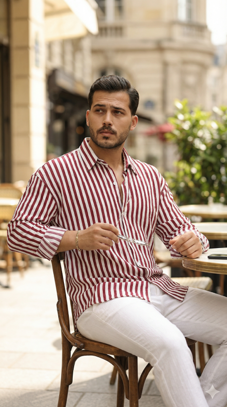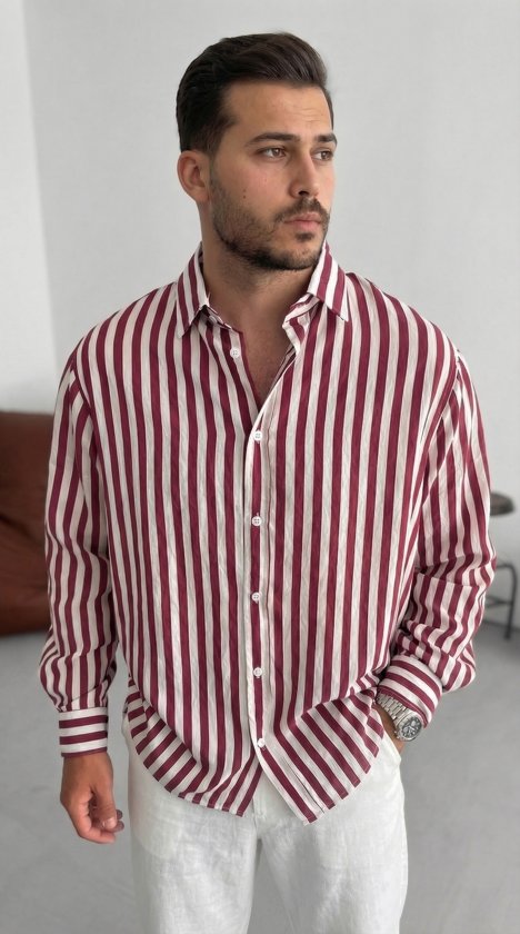 Erkek Salaş Stil Dikey Çizgili Yarım Oversize Gömlek