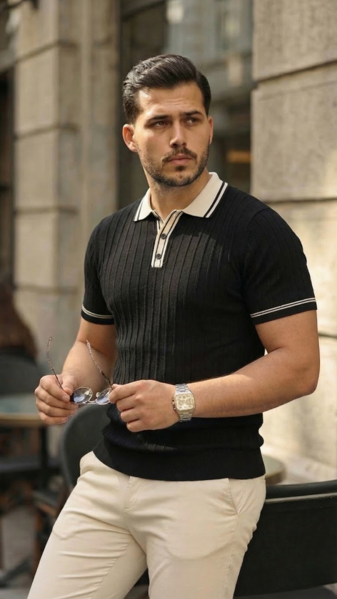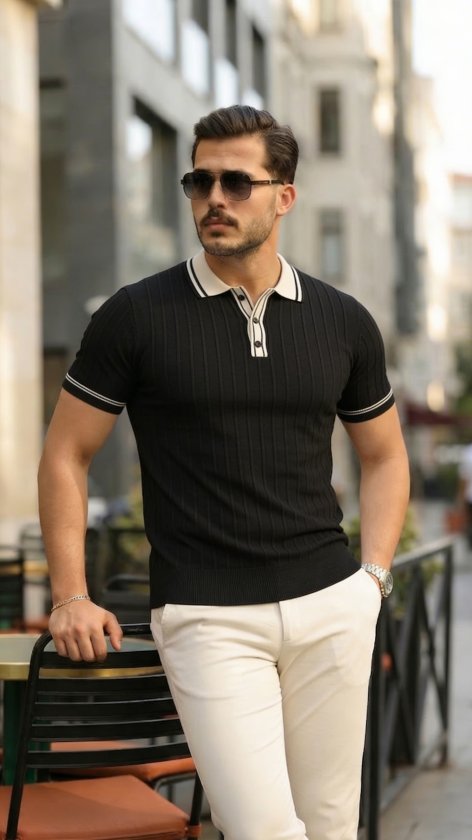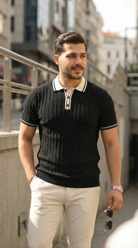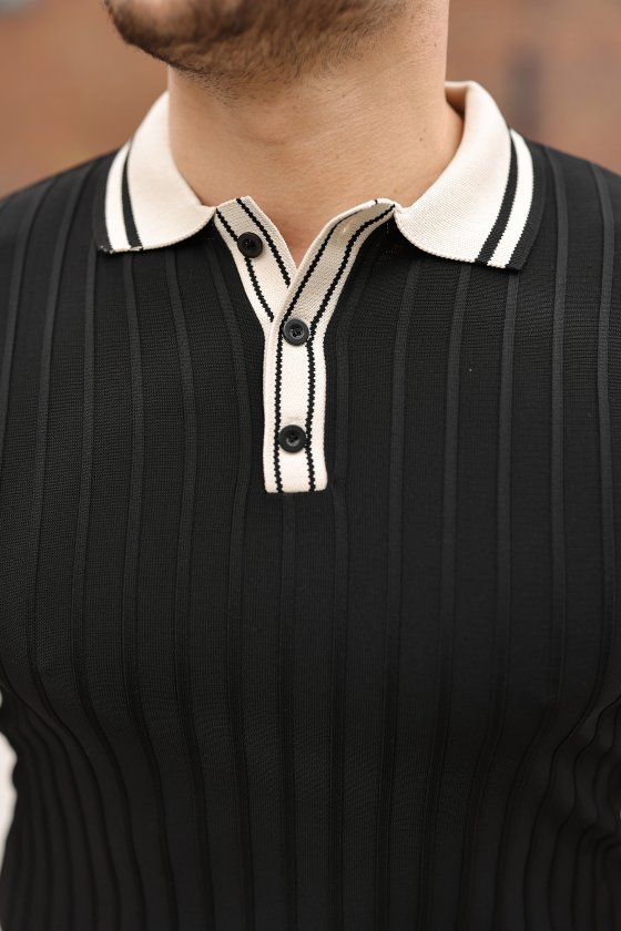 Erkek Düğme Yakalı Kontrast Yaka Triko Tişört