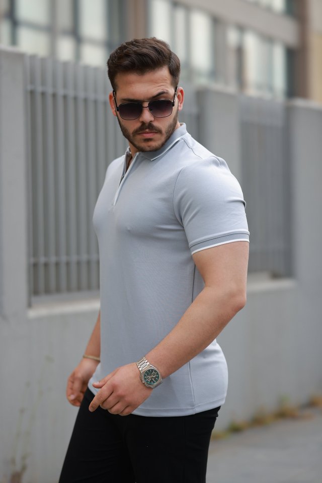 Erkek Fermuar Yakalı çizgi Detaylı Kısa Kollu Tişört