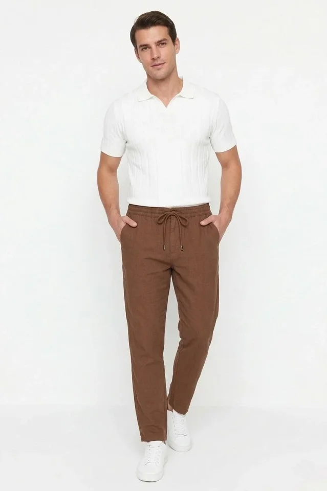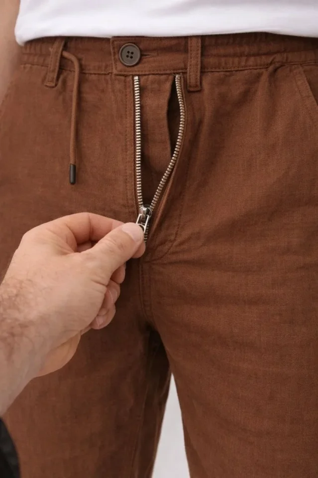 Erkek Keten Cepli Pantolon Lastikli Bel Bağcıklı Önden Fermuarlı – Kahverengi