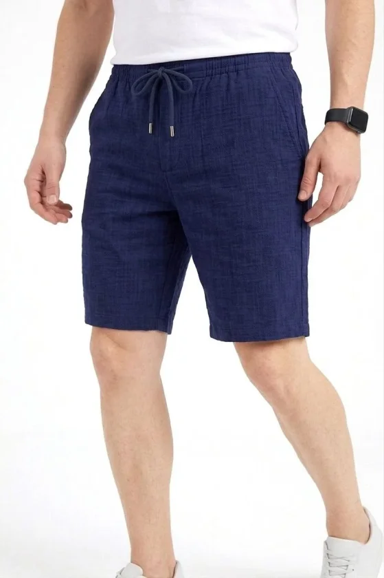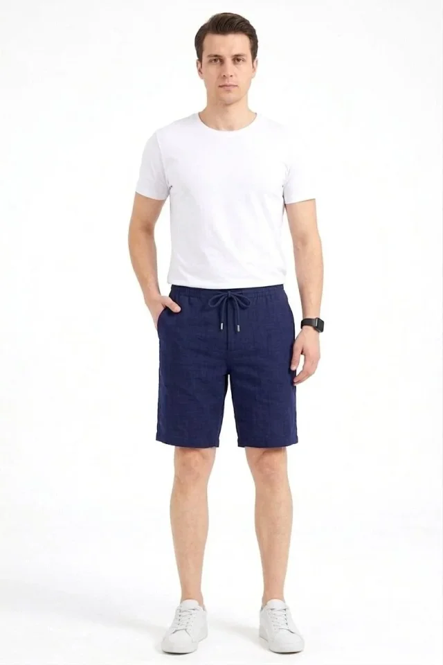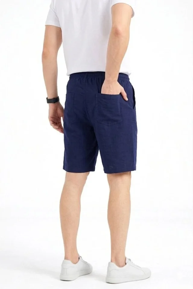 Erkek Rahat Kullanım Lacivert Keten Kumaş Cepli Rahat Kesim Bel Lastikli Şort