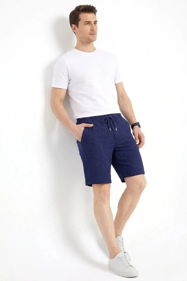 Erkek Keten Kumaş Cepli Rahat Kesim Bel Lastikli Şort – Lacivert