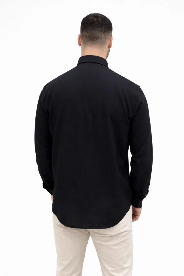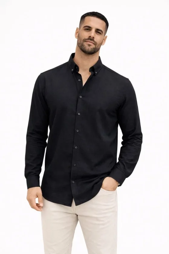 Erkek KETEN Kumaş Oversize Uzun Kollu Rahat Kalıp Gömlek – Siyah