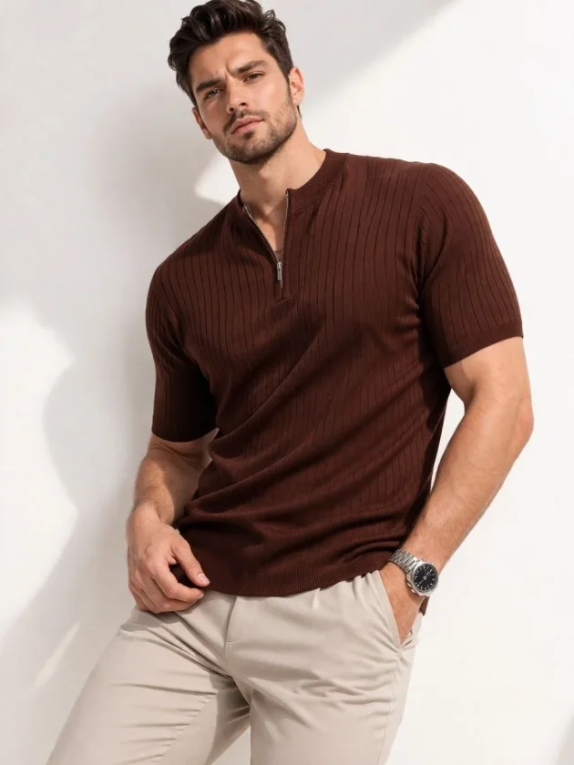 Erkek Kısa Kol Fitilli Triko T-Shirt Yazlık Hakim Yaka Tişört – Kahverengi