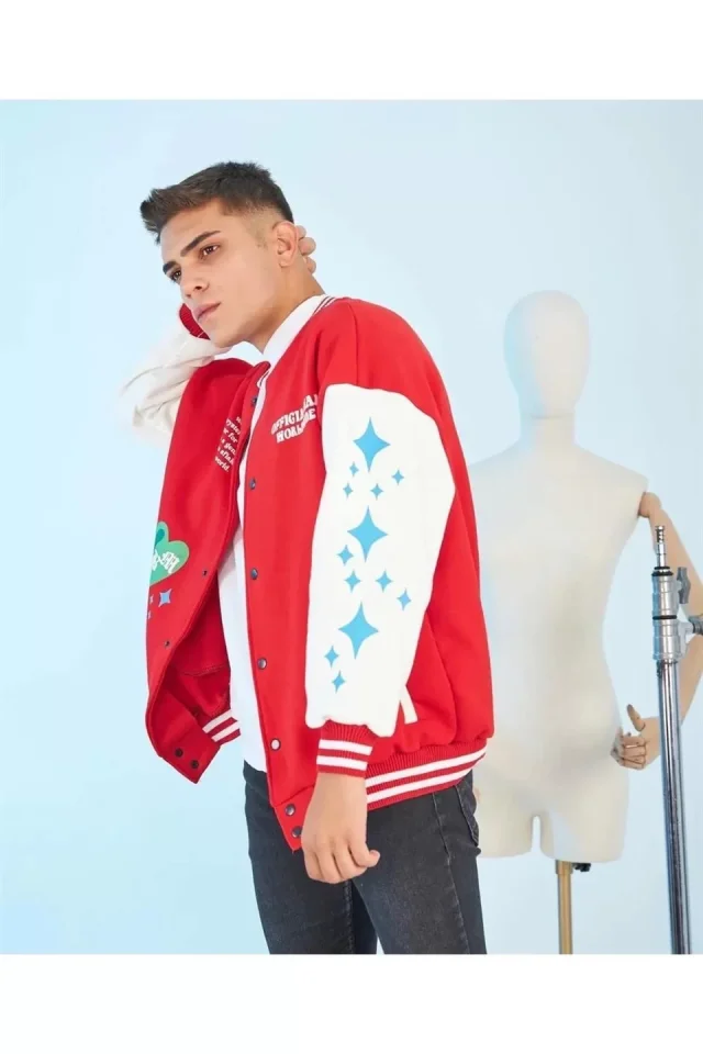 Erkek Kolları Yıldız Sırt Baskılı Oversize Kolej Ceket – Kırmızı