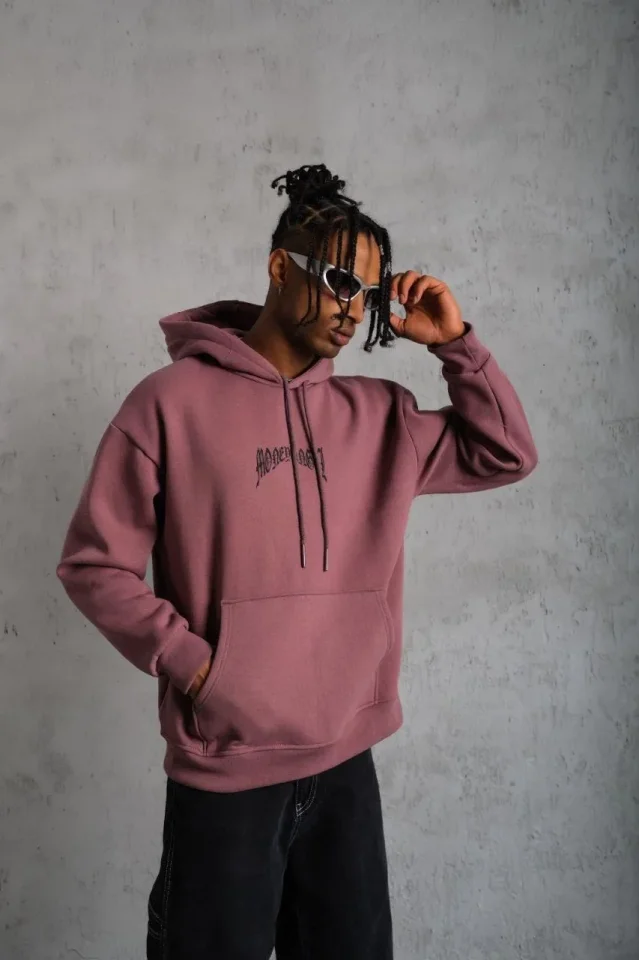 Baskılı Erkek Günlük Stil Gül Kurusu Kordon İpli Kapüşonlu Sweatshirt